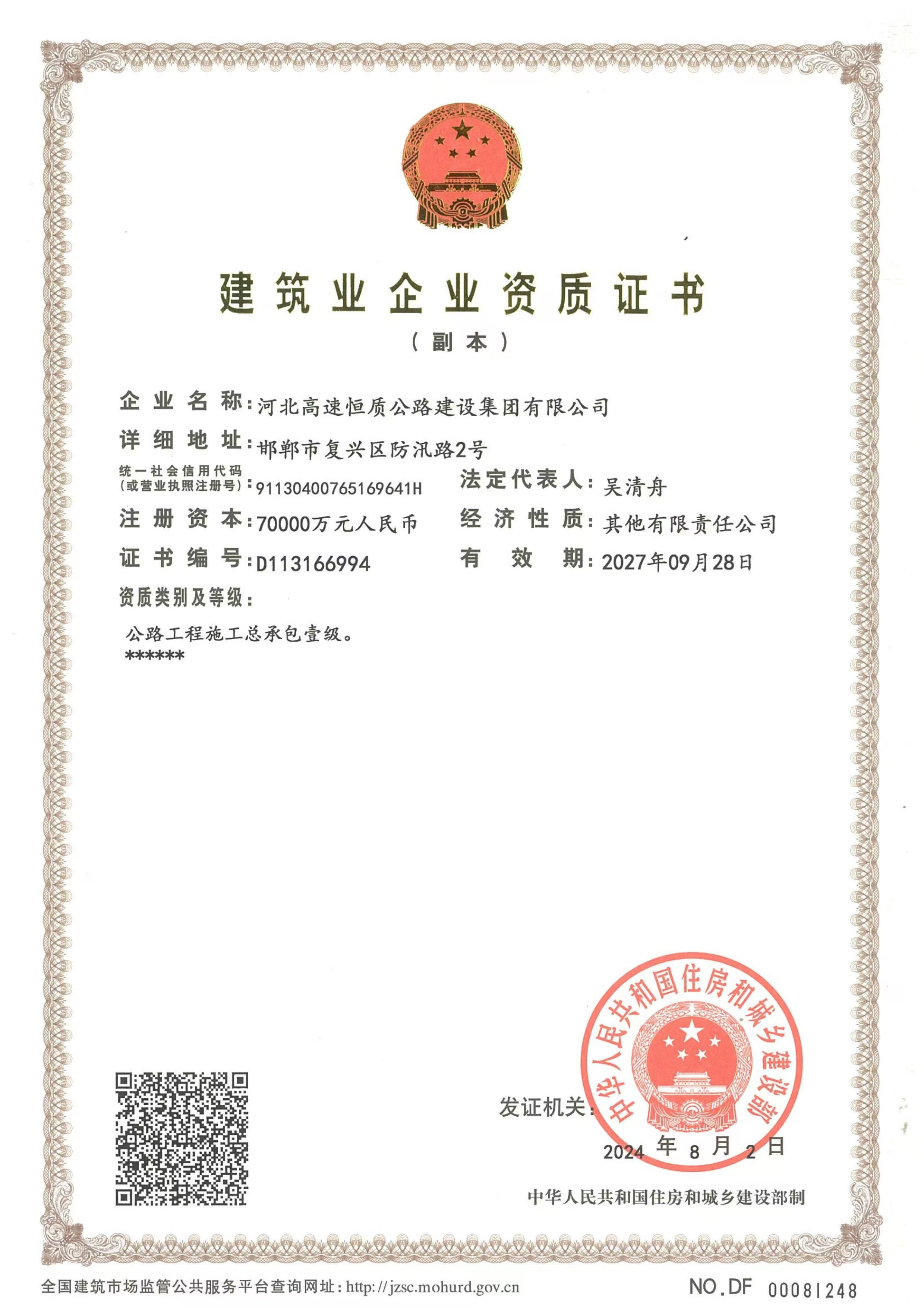 河北高速恒質(zhì)公路建設(shè)集團(tuán)有限公司始建于2004年,前身是邯鄲市恒質(zhì)公路建設(shè)集團(tuán)有限公司。2024年7月成為河北高速公路集團(tuán)有限公司二級子公司,現(xiàn)有職工500余人,下轄18家子公司13個分公司,參股公司3家 ,注冊資本7億元,是一家集公路工程施工、路用材料研發(fā)生產(chǎn)、試驗(yàn)檢測、瀝青貿(mào)易、公鐵物流于一體的多元化、綜合性單位,國家級高新技術(shù)企業(yè),河北省專精特新中小企業(yè),河北省首家瀝青拌合環(huán)保引領(lǐng)性企業(yè)。公司擁有公路工程總承包壹級、公路交通工程(公路安全設(shè)施)專業(yè)承包壹級、機(jī)電工程施工總承包貳級、電力工程施工總承包貳級、市政公用工程施工總承包貳級、建筑工...